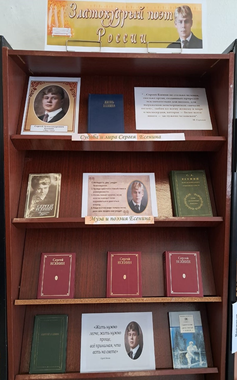К 130-летию поэта на абонементе Центральной библиотеке организована выставка – портрет «Златокудрый поэт России». На выставке представлены лирические произведения автора и воспоминания друзей и коллег С. Есенина. Выставка работает до 16 октября.