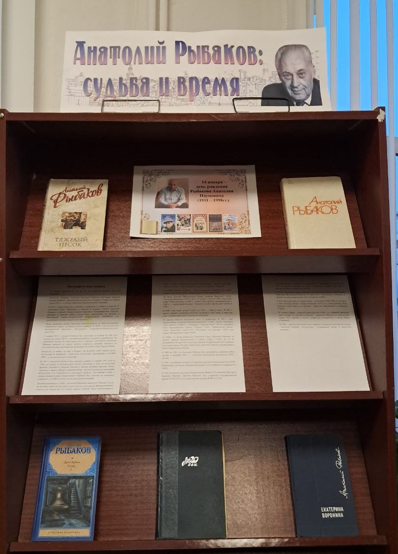 14 января отмечается 115-летие со дня рождения Анатолия Наумовича Рыбакова, знаменитого русского писателя XX века. Его перу принадлежат такие известные произведения, как «Кортик», «Бронзовая птица», «Водители», «Тяжелый песок» и тетралогия «Дети Арбата». В честь этой даты в Центральной библиотеке на абонементе открыта выставка-портрет «Анатолий Рыбаков: судьба и время», где представлены его книги, а также материалы о его жизни и творческом пути. Произведения Рыбакова занимают почетное место в золотом фонде советской литературы, а снятые по ним фильмы завоевали любовь многих поколений зрителей.